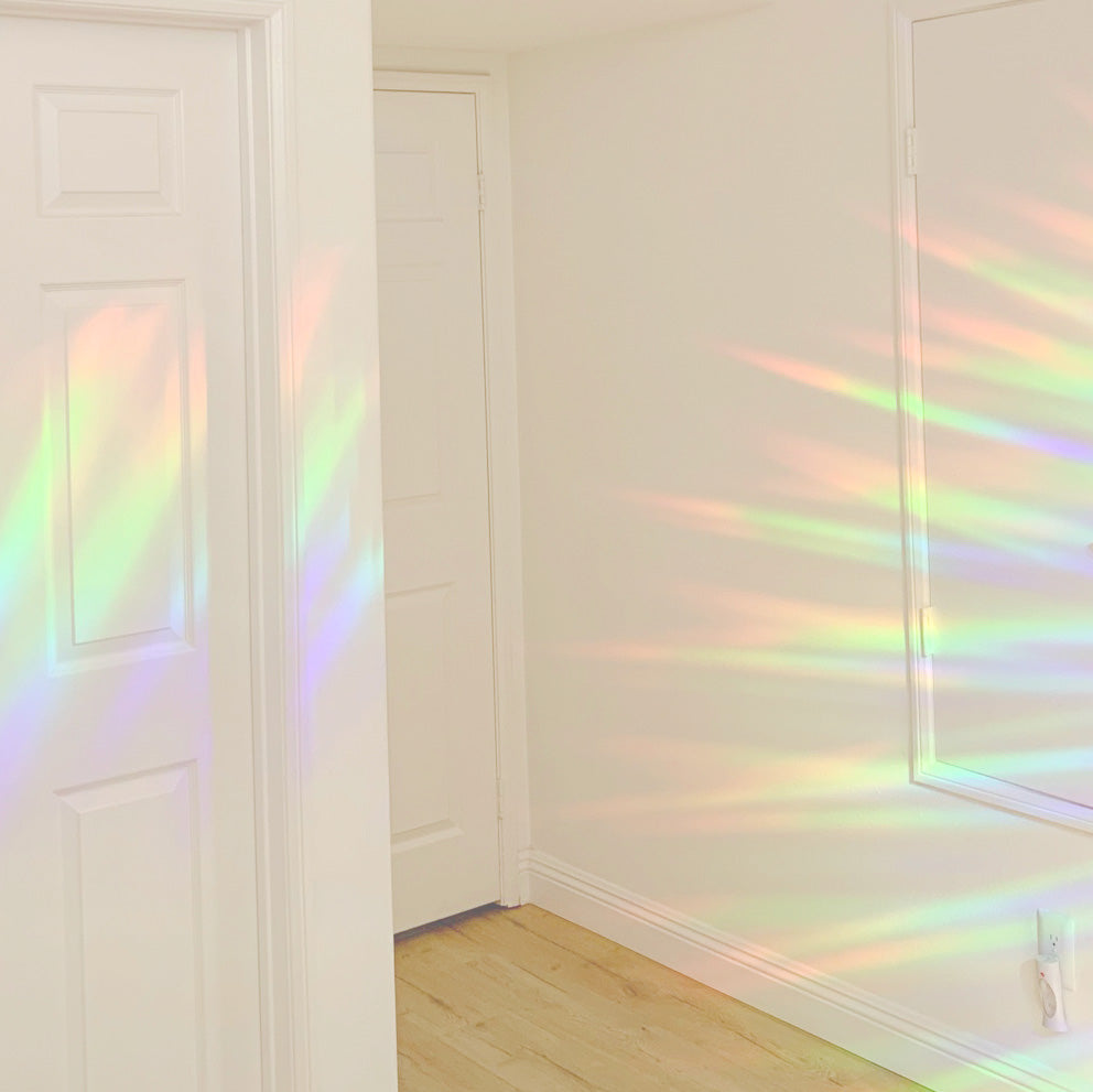Als de zon er direct doorheenschijnt krijg je fantastische regenbogen binnen. Omdat de zon elke keer op een andere plek staat, verschijnen de regebnogen elke keer op een andere plek.
